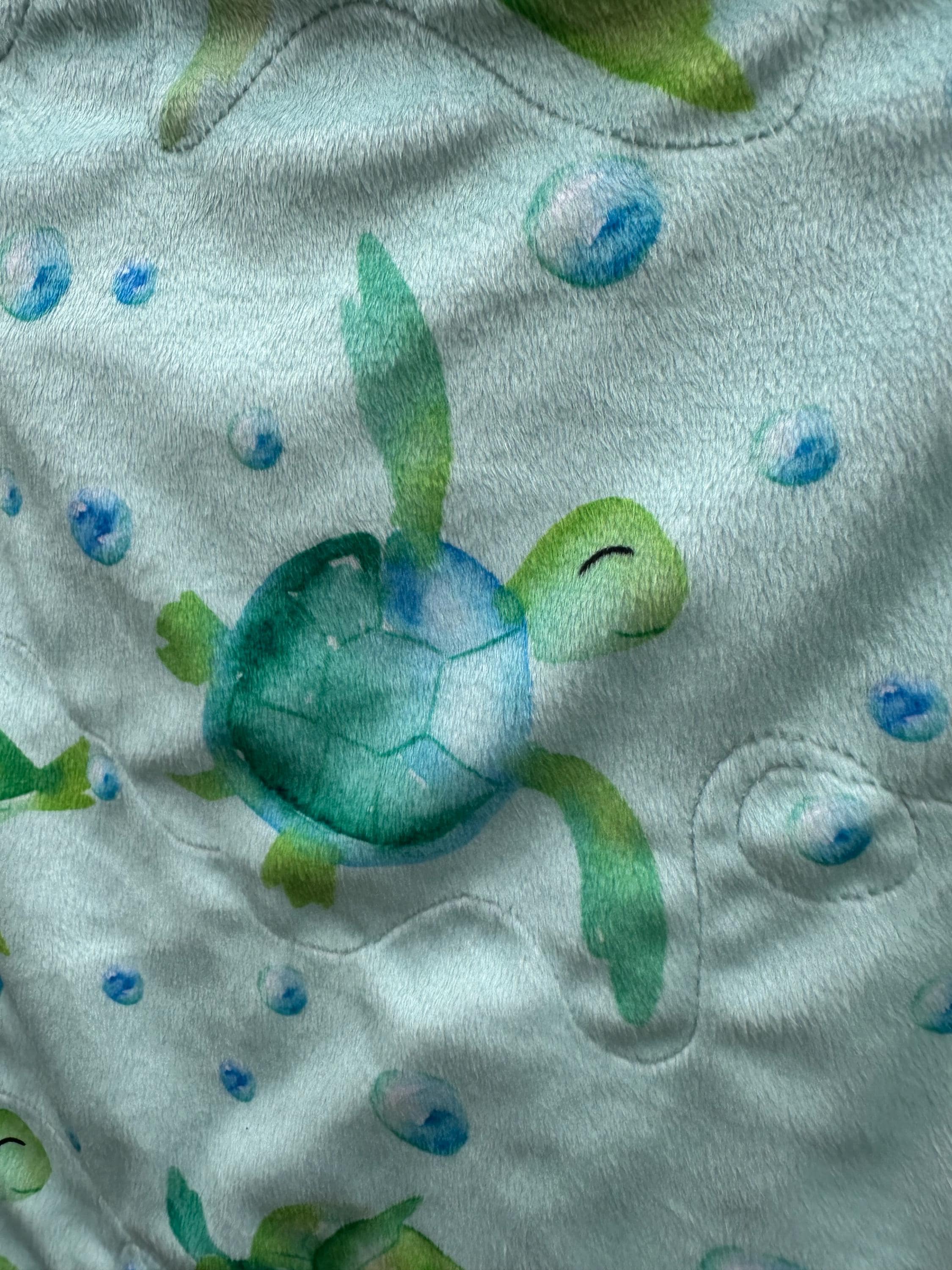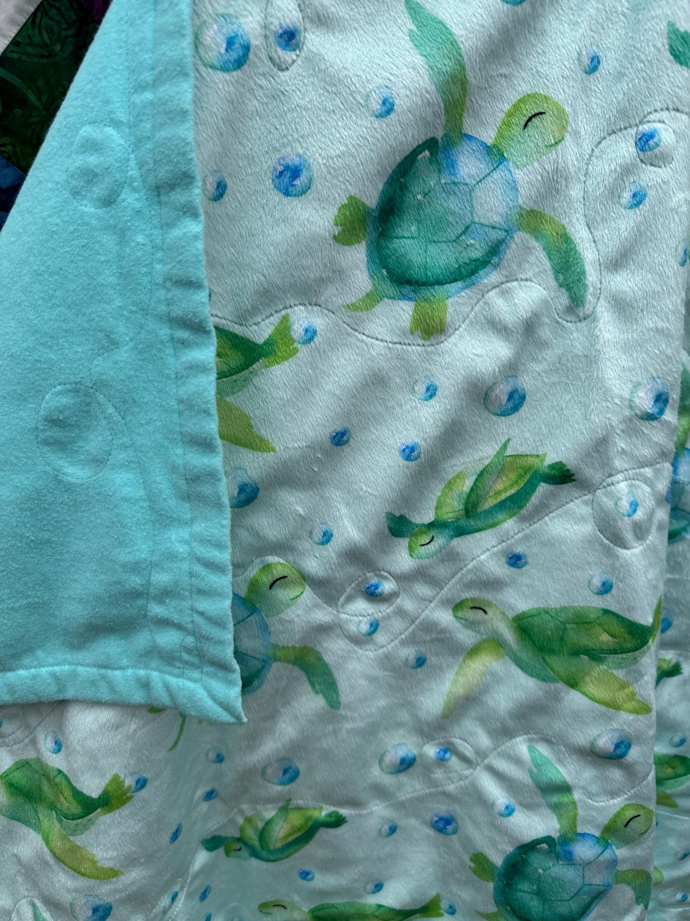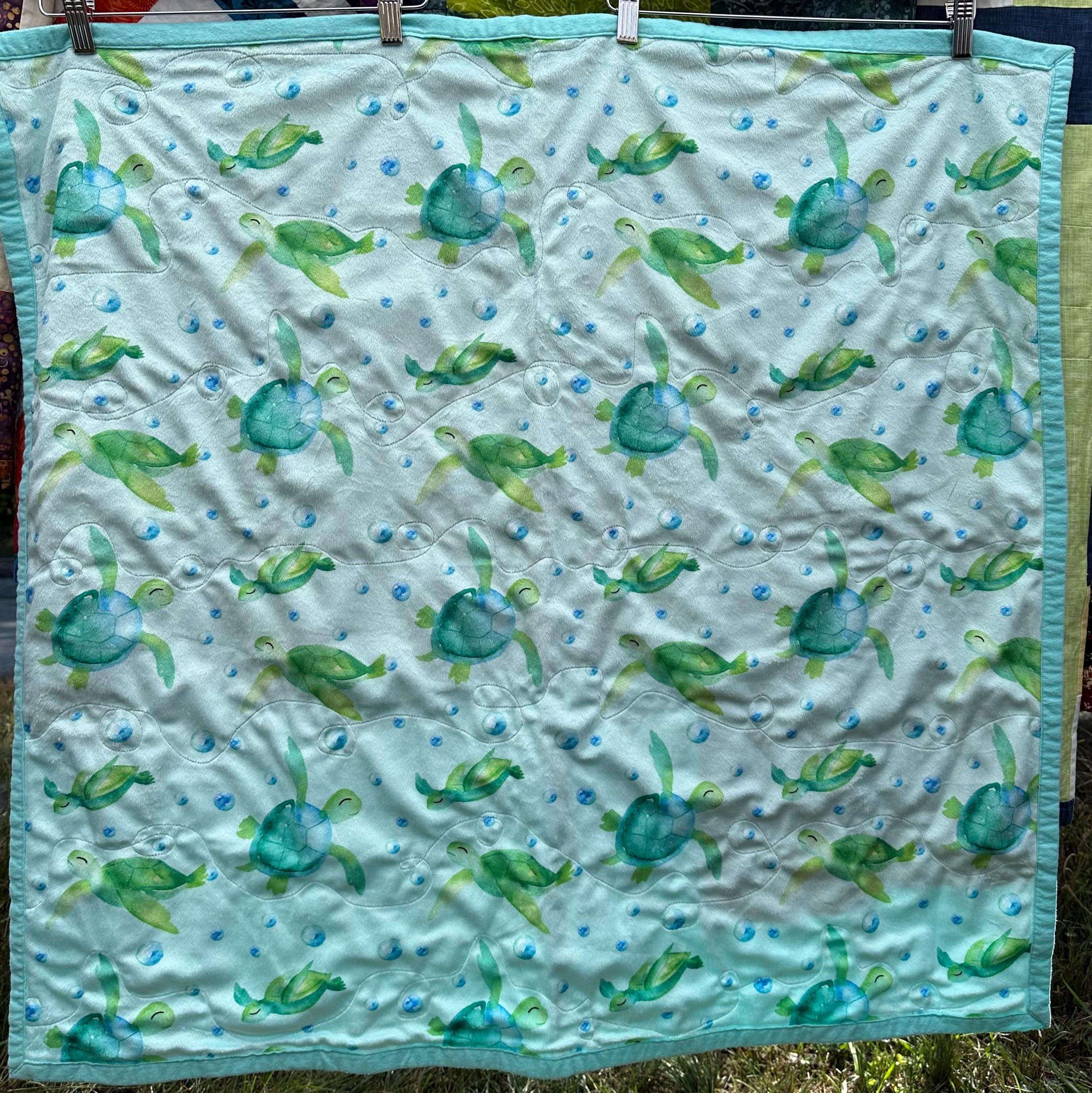 A lighter-weight, baby-sized blanket made with soft and cozy minky flannel. Handmade and machine-stitched.