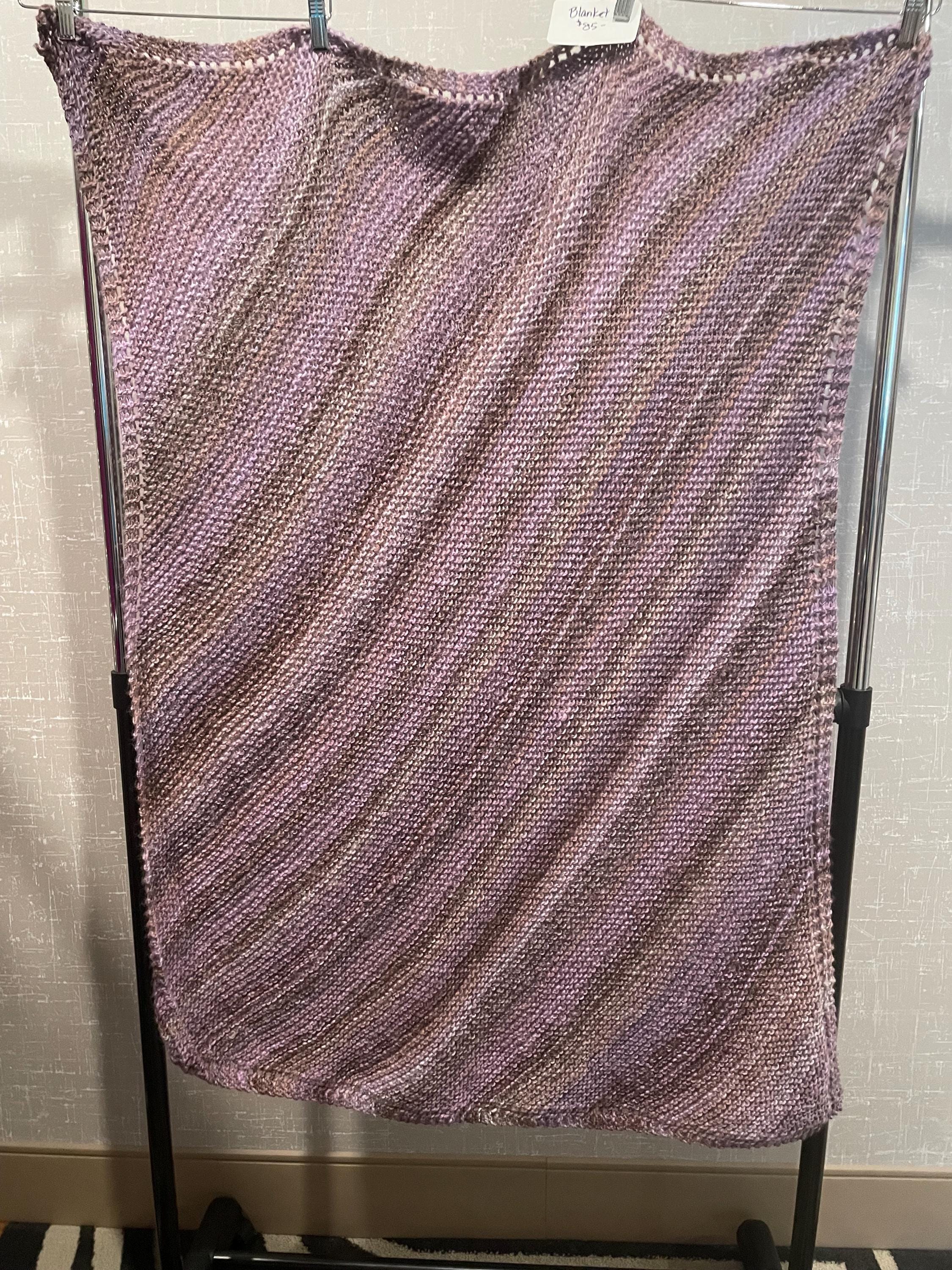 Needle knit by hand with Bernat yarn (lightweight, soft and comfy)! Perfect for a lightweight cozy blanket or wrap. diagonal pattern is versatile and the shades of purple are beautiful creating depth.