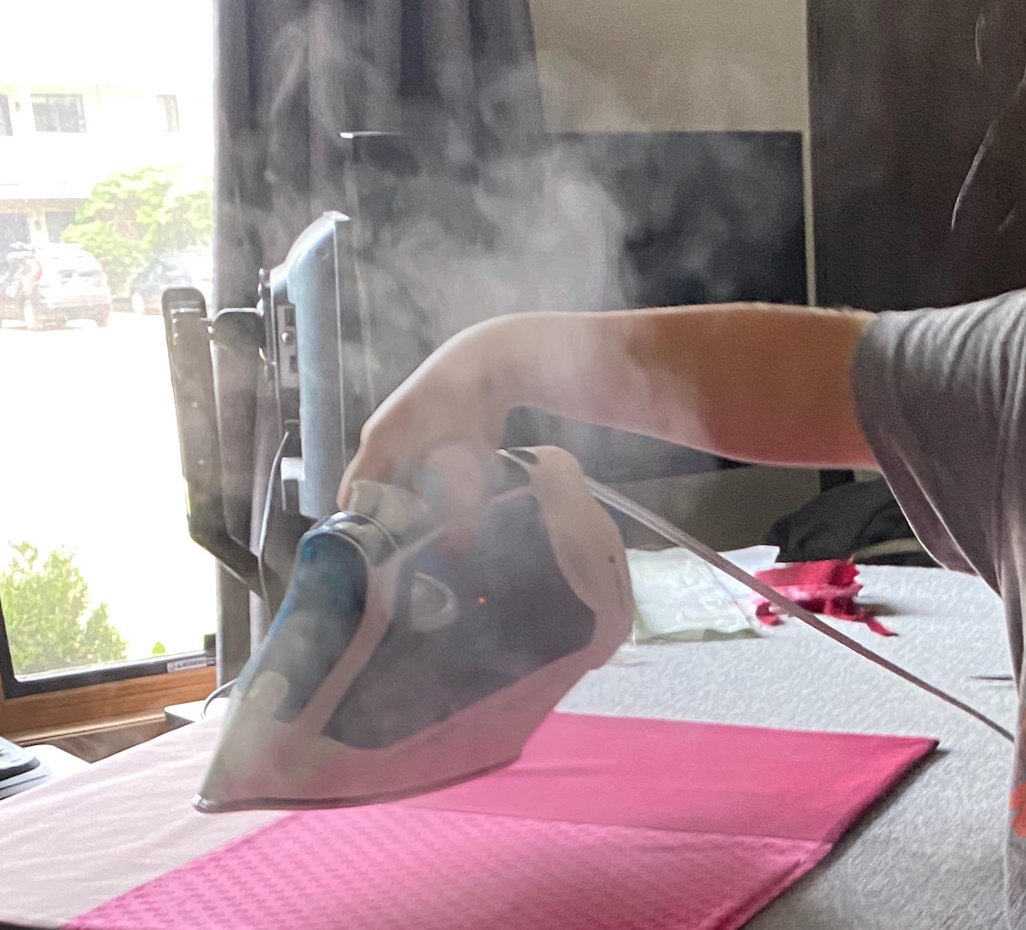 You'll want an iron that produces lots of steam, all on its own, without having to keep your thumb constantly on the steam button. I love my Rowenta, but there are other options in the under $100 price range. Here, my apprentice (and adorable niece) demonstrates my iron's steaming ability.