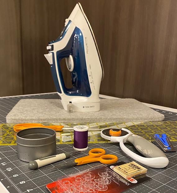 The most commonly used items in my sewing room are: a cutting mat, ruler, rotary cutter, sewing pins, iron and ironing board, scissors (both a large and small pair, used exclusively for quilting), seam ripper, bias tape maker, as well as spare sewing machine needles and bobbins.