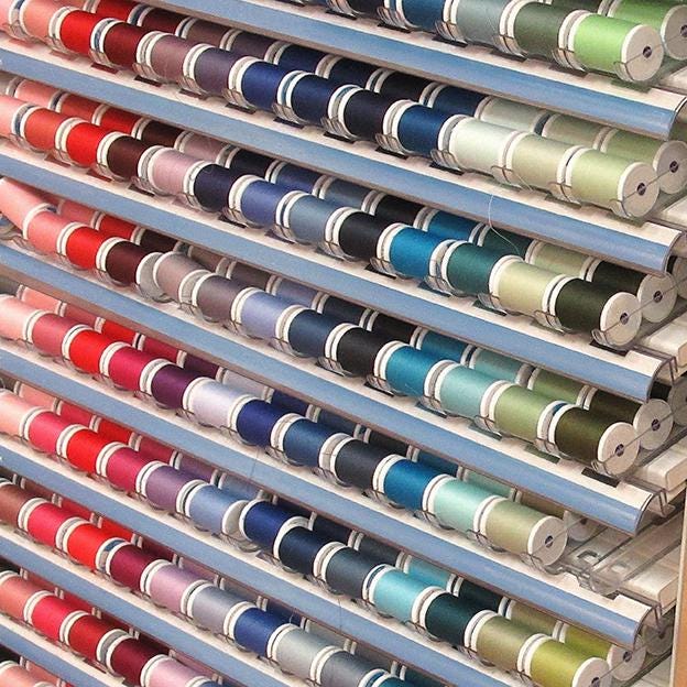 Break out your machine's owner manual and see which thread weight is recommended. For quilting, a 30-weight thread will likely be recommended, but you should always double check. The most common brand of 30-weight thread you'll find at quilting/craft stores is Coats and Clark, which works well for machine-based stitching. I tried using a cheaper option once, and ... it did not go well. The thread was thinner and prone to breaking. Coats and Clark is widely available, provides 100+ color options, is affordable, and holds up very well.