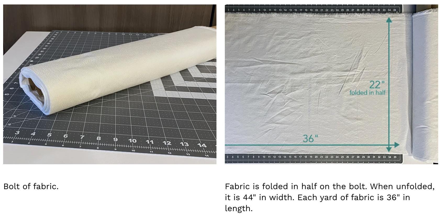 Fabric is typically sold on bolts (except for pre-cuts. Bolt fabric comes in varying widths, from 36" to 108", although cotton bolts are traditionally 44" wide. The "yard" measurement refers to the length of the cut as the fabric is rolled off the bolt. So, one yard of cotton fabric measures 36" x 44", and patterns use this size to compute yardage - they even take into account any shrinkage that may occur in the wash.